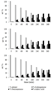 In Figure 2 the formation rate of the main by-products, i.e. hydroquinone, benzoquinone and maleic acid, is reported, at different phenol starting concentration using K1077 powder. It is clear that a change of the initial concentration causes some changes in the by-product formation, in particular for the different molecule distributions. The development of photodegradation process leads to progressive disappearance of phenol, never completely, and progressive appearance of hydroquinone, benzoquinone and maleic acid. For each initial concentration, the amount of aromatic species decreases over time and increases the amount of maleic acid. Moreover, comparing the developments of the different tests, the amount of aromatic species is reduced in proportion to the initial concentration of phenol.