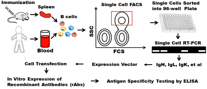 Figure 2. Single cell mAb cloning using FACS. Single cell sorted using FACS. IgG genes are amplified using single cell RT-PCR, transfected into 293 T cells with appropriate expression vector for recombinant mAbs.