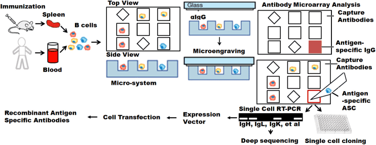 Figure 3. Microsystem enabled single cell monoclonal antibody cloning. Antigens-specific antibody secreting cells (ASC) are identified based on antigen-specific IgG secretion using either microengraving or on-ship immunoassay. Identified single cells can be directly used for single cell cloning. IgG genes isolated from these single cells can be amplified with single cell RT-PCR for either deep sequencing or in in vitro recombinant mAb production.