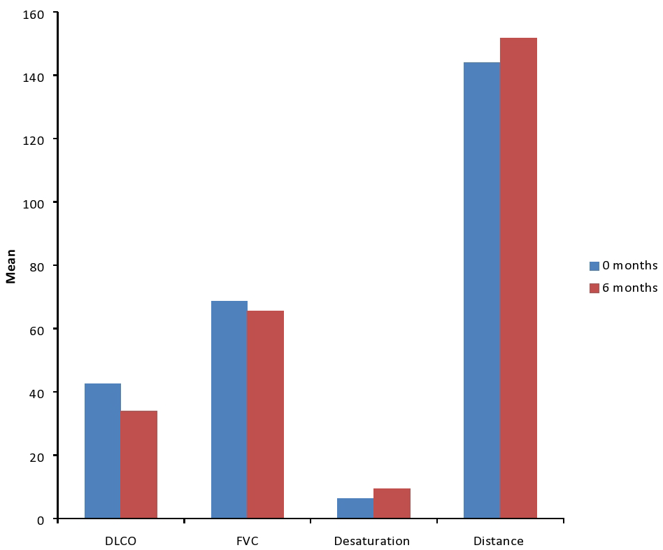 This statistically significant increase in value of desaturation during 6MWT closely followed the statistically significant decline in FVC, DLCO and grading of dyspnea in our patients (Table 3).