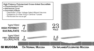 Orafate has a device mechanism of action that leads to expedited healing and alleviation of pain. The more efficient compounded layering of polymerized cross-linked sucralfate results in an adherent restrictive micro-environment across the surface to which it is applied. Transiently fixed micro-environs created by adherent HPPCLS facilitate the progression of feed-back controlled-reversal of inflammation. Restrictive micro-environs fashioned by cross-linked layers of polymerized sucralfate “crowds” free-moving anti-inflammatory and pro-inflammatory mediators, indirectly limiting their random movements to “sucralfate-pockets” that overlie mucus gel covered membrane-bound receptors. Spatially limiting the movement of pro-inflammatory and anti-inflammatory mediators to the vicinity of their respective receptors heightens the chances of receptor site activation. This device action leads to expedited healing.