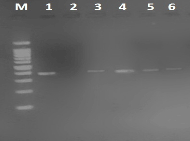 Figure 1. RSV-A result (391bp) on 2% agrose gel. lane1 shows positive control, lanes 2,4,5 and 6 show results in patients, lane 2 show negative control, M: 100bp DNA Marker.
