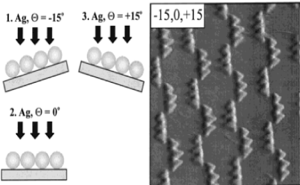 This technique can be used to form one dimensional nanostructure arrays. The surface normal of a substrate in the deposition chamber is positioned at a large angle with respect to the oncoming vapour direction. This leads to a preferential growth of nanorods on the substrate in the direction of the deposition. The nanorods grow aligned but are tilted on the large substrate area. Periodic arrays are achieved by substrate patterning prior to deposition, due to the covering of the substrate with a PS monolayer. The patterned surface mounds are the nucleation sites for the OAD columns, since atomic shadowing of the deposition flux suppresses growth on the surrounding substrate. The close packed is due to the substrate being shadowed during deposition, due to the array of microspheres and then growing nanopillars. The nanopillars replicate the closed packed arrangement of the underlying microspheres.