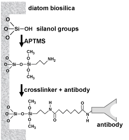 The surface silanol groups on the diatom biosilica pore array can be readily functionalized with biomolecules such as antibodies that serve as recognition elements for biosensing [3]. A typical functionalization scheme is shown in Figure 2. In this scheme, silanol groups are derivatized to amine groups with 3-aminopropyltrimethoxysilane (APTMS).  The antibody is then covalently attached through a bifunctional crosslinking reagent which couples the surface amine group to an amine group on one of amino acid residues (e.g. lysine) on the antibody.  Diatom frustule nanostructures may be particularly attractive for bionanotechnology applications, given the current interest in new approaches for biomolecule nanopatterning [4] with an eye towards microscale ‘‘lab-on-chip’’ applications.