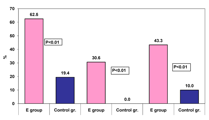 Anxiety was found in 55.0% of cases in the experimental group and 23.3% of cases in the control group, significant statistical difference (P <0.01). Depression occurred in 26.7% of cases in the experimental group and 6.7% of cases in the control group significant statistical difference (P<0.01). Hypochondriasis occurred in 36.7% of cases in the experimental group and 6.7% of cases in the control group, significant statistical difference (P<0, 01). Phobias occurred in 10.0% of cases in the experimental group and 6.7% of cases in the control group without significant statistical difference (P>0, 05). Impulsive aggressive tendencies occurred in 21.7% of cases in the experimental group and 1.7% of cases in the control group with significant statistical difference (P<0.01) (Table 3 and Figure 2).