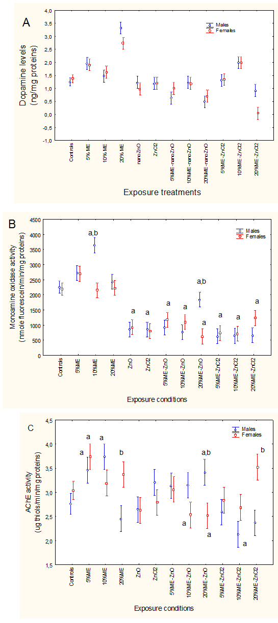 FHM were exposed to the ME, nano-ZnO and ZnCl2 alone and in combination. The levels of brain dopamine (A), mono-amine oxidase (MOA) activity (B) and acetylcholinesterase (AChE) activity (C) are reported. The letter a indicates significant from controls and b significant between males-females at a given treatment condition.
