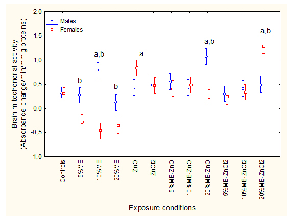 Cellular metabolic energy expenditure 2021 Copyright OAT. All rights reservochondrial electron transport (MET) activity (Figure 3).FHM were exposed to municipal effluents, nano-ZnO and ZnCl2 alone and in combination, and cellular energy expenditure was determined following MET activity as described in Methods. The letter a indicates significant from controls and b significant between males-females at a given treatment condition.Factorial analysis of variance indicated that all factors were significant with effluent/Zn treatments *sex interaction. MET activity was similar in females and males. It was decreased in females exposed to municipal effluent alone and increased in males exposed to 10% municipal effluent. Dietary nano-ZnO slightly increased MET activity in females. The combination of 20% municipal effluent with fish fed nano-ZnO-spiked feed increased MET activity in males while the combination of the 20% municipal effluent with fish fed a ZnCl2-spiked feed increased MET activity in females. Correlation analysis revealed that MET activity was significantly correlated with brain LPO (r=0.33; p<0.001), MT (r=-0.31; p<0.01), DOP (r=-0.46; p<0.01), and Cu (r=-021; p<0.05). The extent of DNA damage was determined using the alkaline DNA precipitation assay (Figure 4).FHM were exposed to the ME, nano-ZnO and ZnCl2 alone and in combination and DAN strand breaks in brain homogenates were determined as described in Methods. The letter a indicates significant from controls and b significant between males-females at a given treatment condition.