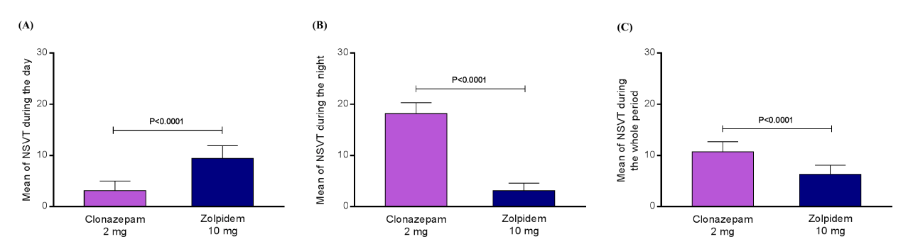 Figure 2: The mean number of non-sustained ventricular tachycardia recorded by the 24-hour Holter monitoring during the day (A), night (B), and whole period (C), for the subjects using 2 mg of clonazepam, as well for the individuals using zolpidem 10 mg. NSVT, non-sustained ventricular tachycardia; N=15 for each group.