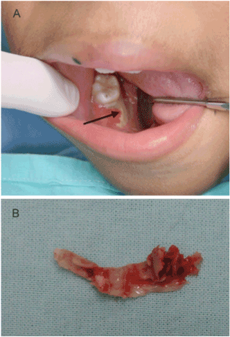 Figure 3. Male patient, 9 years old, developed AML and was admitted to hospital for cancer treatment. (A) Osteomyelitis on the right side of the mandible was diagnosed after tooth extraction (arrow). The patient was treated with systemic antibiotics, daily irrigation with hydrogen peroxide 10v and sodium iodide 2%, followed by removal of sequestrum (B).