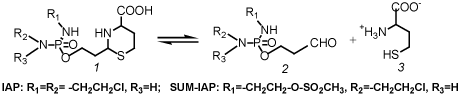 Toxicity tests and therapy tests in mice with Ifosfamide (IF) and these IF derivatives demonstrated a clear decrease in toxicity and a strong increase in antitumor activity in the P388 mouse leukemia model. LD50 for acute toxicity in mice was determined to be 2.3 mmol/kg for Ifosfamide (IF) compared to 6.4 mmol/kg determined for IAP. IAP is the perhydrothiazinylphosphamide ester of aldo-Ifosfamide (Figure 3). In therapy experiments in P388 tumor bearing mice with equitoxic doses of IF and IAP long time survivors (survival time >100d) were achieved with IAP but not in the experiments with IF. An almost explosive enhancement of the antitumor activity was shown in comparative therapy experiments with equimolar doses of IAP and SUM-IAP in advanced solid growing P388 tumor bearing mice. In SUM-IAP one 2-chloroethyl group of the IF structure of IAP is replaced by a mesylethyl group (Figure 3). While in the experiments with IAP only a marginal delay in tumor growth was measured, the tumor mass in the experiments with SUM-IAP was reduced below detection level [9].
