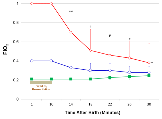 This was addressed in a small pilot study in infants < 32 weeks GA, randomized to 21%, 40% or 100%O2 and resuscitated as per 2005 NRP guidelines [20]. Oxygen groups and SpO2 were unmasked at 10 minutes of age and FiO2 adjusted to maintain SpO2 of 85%-95% for the next 20 minutes. The study was stopped at 30% enrollment following publication of the 2010 NRP guidelines, which is a limitation. The mean SpO2 values were 50%, 53% and 69% at 1 min; 77%, 83% and 95% at 5 min and 92%, 92% and 98% at 10 min in 21%O2, 40%O2 & 100%O2 groups respectively (Figure 1) [20]. Resuscitation of premature infants with 100%O2 resulted in SpO2 values above the upper limit of the 2010 NRP guidelines (Figure 1 – red line; open diamonds); 40%O2 resuscitated group had mean SpO2 values below the NRP lower limit in the first five minutes and within the NRP defined SpO2 target range from 6 to 10 minutes (Figure 1 – blue line; open circles); 21%O2 resuscitated group had mean SpO2 values bordering the NRP lower limit in the first five minutes and within the NRP defined SpO2 target range from 6 to 10 minutes (Figure 1 – green line; closed squares). Similarly, there were no differences in SpO2 at 10 and 30 minutes after birth among the groups [20]. Infants in 21%O2, 40%O2 and 100%O2 groups were weaned to 24.8% (±5), 27.9% (±6) and 38% (±20) O2 respectively at 30 minutes of age (Figure 2) [20]. Despite aggressive weaning, FiO2 administered was significantly higher in the 100%O2 group to maintain the target SpO2 until 30 minutes of age; however, there was no significant difference in FiO2 between 40%O2 and 21%O2 groups during the weaning process (Figure 2). The novelty of this study was in administering a fixed concentration of oxygen and blinding the study gas for the first 10 minutes irrespective of the SpO2. This pilot study does demonstrate that resuscitation with 21%O2 is feasible and the evolution of SpO2 in the first 10 minutes following 21%O2 resuscitation are fairly close to NRP saturation limits.