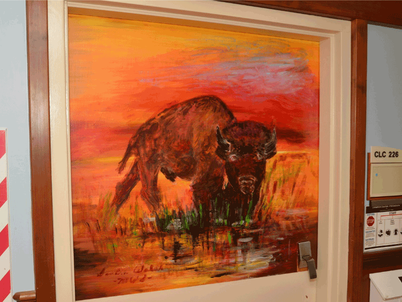 Participants then became thoughtful, engaged, and offered multiple suggestions. Artists advised participants that once the painting was signed and varnished there would be no more changes. Participants were offered one last chance to request changes prior to the varnishing. An amusing, unusual last change was requested by one resident for the “The Buffalo” painting (See #2 door story and painting). The resident, who was described as a loner, began to converse (socialize!) with fellow male residents about “his” Buffalo. They agreed that the artist had not portrayed the male sex of the buffalo distinctly. Last minute “enlargements” were made before varnish was applied.