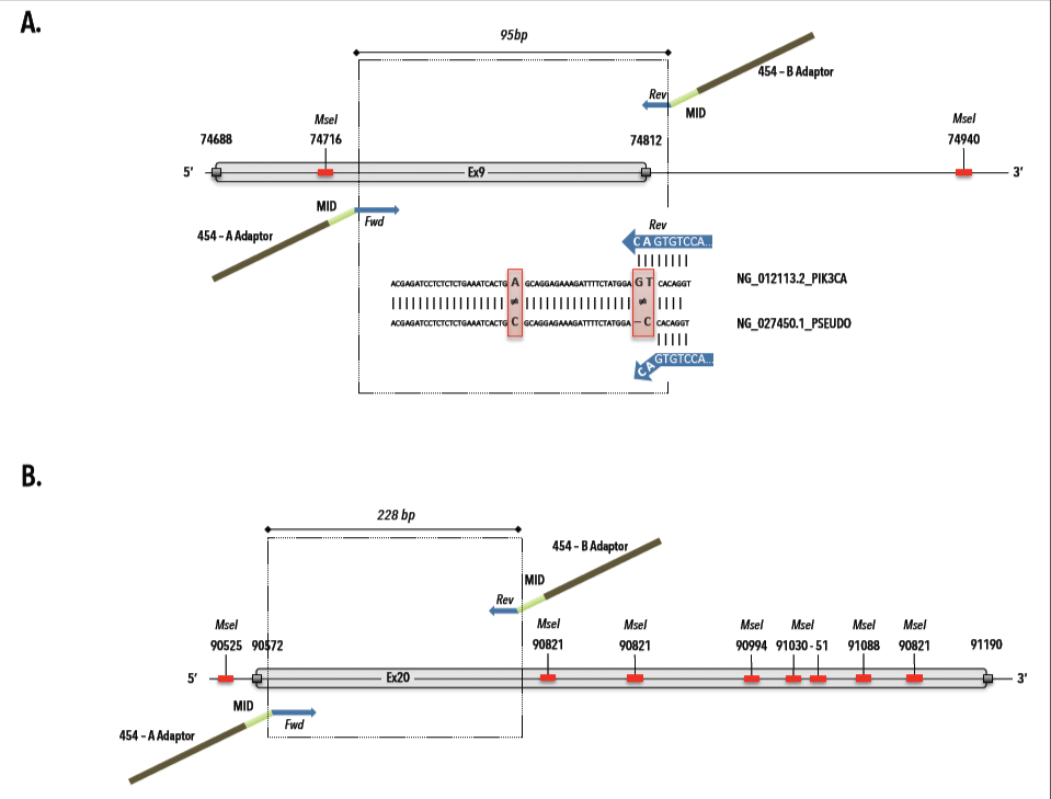 Figure 1. MseI restriction map and 454 fusionprimer design for PIK3CA exon 9 and 20. A) Primer design for PIK3CA exon 9 (gi|383087749|ref|NG_012113.2|:74685-74946 Homo sapiens phosphatidylinositol-4,5-bisphosphate 3-kinase, catalytic subunit alpha (PIK3CA), RefSeqGene (LRG_310) on chromosome 3) with selection of target-specific reverse primer, which avoids pseudogene (ref|NG_027450.1|: Homo sapiens phosphatidylinositol-4,5-bisphosphate 3-kinase, catalytic subunit alpha pseudogene (LOC100422375) on chromosome 22) amplification.