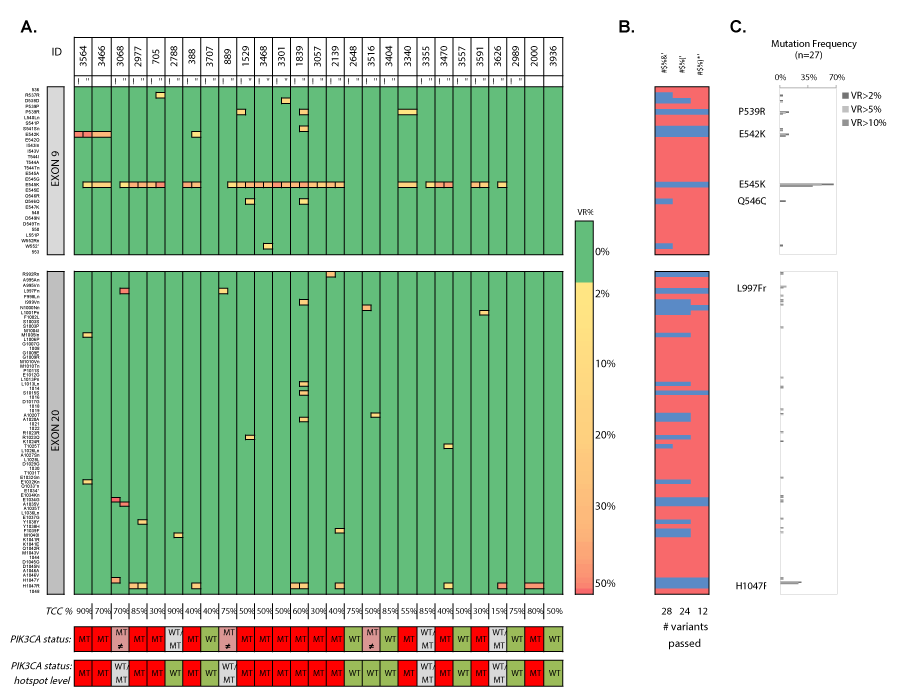 Figure 11. Heatmap en frequency plots of missense and synonymous mutations in PT samples in two independent sequencing runs. A) Heatmap of detected variants, presented with the detected variant read frequency (see color scale), ranging from >2% to 50%. For unique variants, see supplementary table 14. Lower: PIK3CA status exon wide (upper) and hotspot-focused (bottom). B) Assessment of the number of passed (blue) variants for different variant read frequency cutoffs (2%, 5% and 10%) based on the maximal variant read frequency that was picked up for a given mutation. C) Mutation frequencies (%) in FFPE primary tumor samples (n=27) with P539R, E542K, E545K, Q546Q, L997Fn (new) and H1047R as most frequently detected substitutions. VR% denotes variant read frequency. MT denotes MT. WT denotes WT. MT ≠ denotes inconsistent variants between technical replicates. WT/MT denotes WT or MT genotypes between technical replicates. a/b denote independent sequencing runs I and “ denote replicate 1 and 2, respectively.