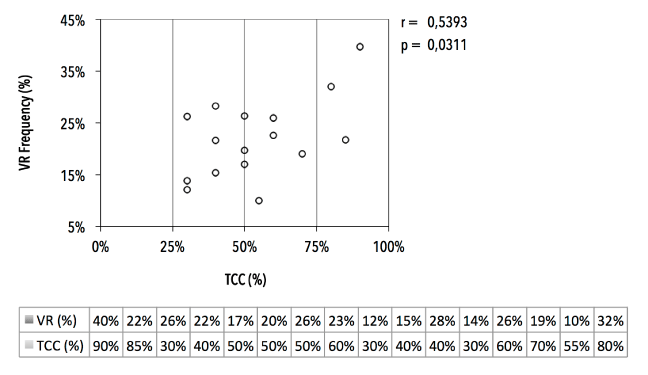 Figure 12. Correlation of tumor cellularity in FFPE tissue sections and mutation frequencies. Variant read frequency (VR%, in %) of major PIK3CA hotspot mutations in function of tumor cell content (TCC, in %) of FFPE primary tumor tissue section (n=16).
