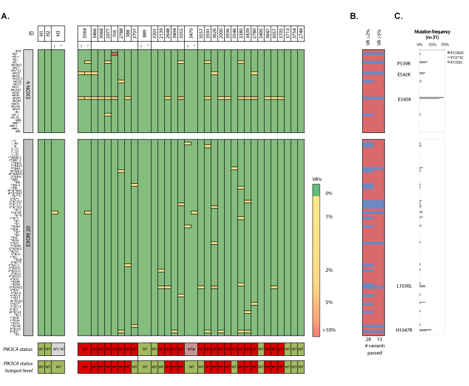 Figure 14. Heatmap en frequency plots of missense and synonymous mutations within exon 9 and 20 in cfDNA samples. A) Heatmap of detected variants, presented with the detected variant read frequency (see color scale), ranging from >2% to >10%. Lower: PIK3CA status exon wide (upper) and hotspot-focused (bottom). For unique variants, see supplementary table 15. B) Assessment of the number of passed (blue) variants for different variant read frequency cutoffs (2% and 5%) based on the maximal variant read frequency that was picked up for a given mutation. C) Mutation frequencies (%) in cfDNA samples (n=31) with P539R, E542K, E545K, Q546Q, L1036L (new) and H1047R as most frequently detected substitutions. VR% denotes variant read frequency. MT denotes mutant. WT denotes wild-type. MT ≠ denotes inconsistent variants between technical replicates. WT/MT denotes WT or MT genotypes between technical replicates.