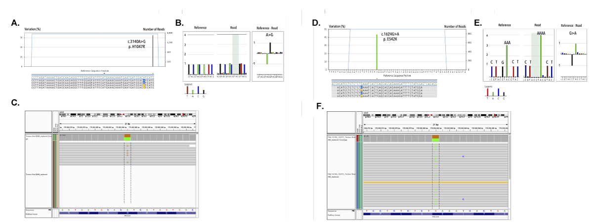 Figure 15. Cross-validation by comparing the mutational status of a pooled CTC sample by 454 targeted amplicon sequencing and whole exome sequencing on the Illumina HiSeq. For patient 2000: A) Targeted amplicon sequencing reveals presence of the missense H1047R in exon 20. B) 454 pyrograms demonstrate validity of picked-up mutations via comparative analysis of number of bases between reference and read base ows. C) Cross validation of pool CTC sample on Illumina HiSeq reproducing the H1047R missense substitution. For patient 3466: D) Targeted amplicon sequencing reveals presence of the missense E542K in exon 9. E) 454 pyrograms demonstrate validity of picked-up mutations via comparative analysis of number of bases between reference and read base ows. F) Cross validation of pool CTC sample on Illumina HiSeq reproducing the E542K missense substitution