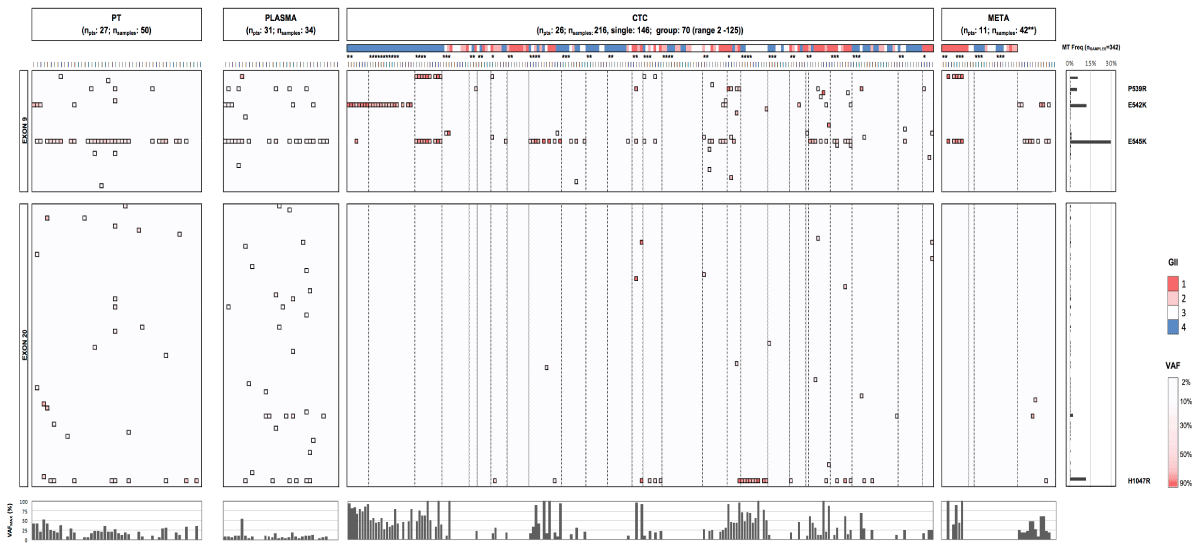 Figure 20. Comparative analysis of PIK3CA genotypes and VAFs in primary tumor, plasma, CTCs and metastases. PIK3CA ex9 and 20 mutational heatmaps across different compartments in patients with HR+ MBC. Color gradient from light to dark red in ex9 and 20 boxes indicates low (2) and high (>80%) VAFs for a particular substitution, respectively. The color scale above CTC and DTC samples (which are grouped per patient by boxes with dotted borders) denotes the genomic integrity index (GII), as determined by Ampli1 QC4 analysis (red: GII1; pink: GII2; white: GII3 and blue: GII4). Bottom bar chart represents the maximum VAF detected in analyzed patient samples and reveals (in comparison to PT and plasma) the enhancement in the VAF of a given mutation when analyzing purified CTC. PT denotes primary tumor, CTC denotes circulating tumor cell, META denotes metastatic lesion, VAF denotes variant allele frequency. (*) denotes group CTC/DTC samples consisting of more than one cell. (**) The 42 metastases samples encompassed FFPE tissues (n=9 patients) and DEPArray-purified disseminated tumor cells (DTCs) from two patients (15 single and 11 group samples, covering 139 DTCs in total).