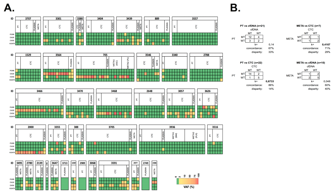 Figure 21. Comparative analysis of PIK3CA genotypes in PT, plasma, CTCs and metastases. A) PIK3CA mutational profiles of hotspot loci across different compartments in patients with HR+ MBC (n=38). Color gradient from yellow to red indicates low (2-10%) and high (>85%) VAFs, respectively. (y) denotes patient id 3754 B) Level of agreement of the PIK3CA mutational status in CTC or cfDNA and corresponding PTs and metastatic lesions. k denotes Cohen Kappa statistics