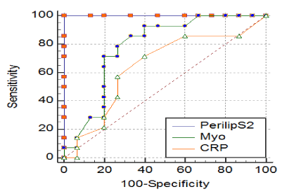 Using ROC analysis, it was found that the diagnostic efficiency of perilipin-2 was excellent, and significantly higher than the efficiency for myoglobin or us-CRP or other parameters (AUC 1, sensitivity 100%, specificity of 100%; the cut-off=15 ng/l, AUC of myoglobin was 0.78 and us-CRP 0.64 (Figure 1).