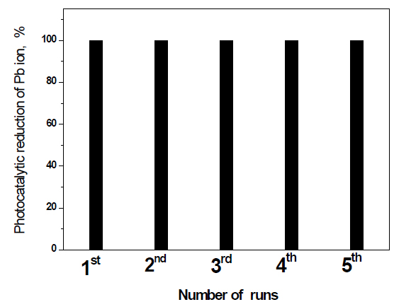 Recycling and reuse of Fe2O3 doped on g-C3N4 -3 wt% photocatalyst for the removal of Pb ions: The recycling and reuse of Fe2O3 doped on g-C3N4 -3 wt% photocatalyst for the removal of Pb ions is shown in Figure 10. The results reveal that Fe2O3 doped on g-C3N4 -3 wt% photocatalyst has photocatalytic stability for the reduction of Pb ions for five times.