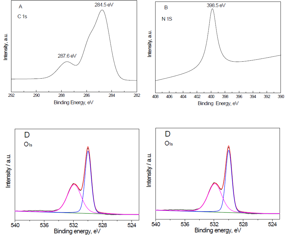 XPS examination: The XPS spectra Fe2O3 doped on g-C3N4 -3 wt% sample is shown in Figure 2. The results demonstrated that the presence of two peaks of C1S at binding energy equal to 287.6 and 284.5 eV confirms the presence of carbon as C=N, as shown in Figure 2A. The presence of a peak of N1s at a binding energy at 398.5 eV confirms the presence of nitrogen as C=N-C (sp2 hybridized nitrogen), as shown in Figure 2B. The presence of two peaks of Fe2p at a binding energy equal to 710.2 and 724.8 eV confirms the presence of Fe3+ ion, as shown in Figure 2C. The presence of two peaks of O1s at a binding energy equal to 529.6 and 532.1 eV confirms the presence of an O2- ion, as shown in Figure 2D. Therefore, the XPS spectra of C, N, Fe and O confirm that the structure of the nanocomposite is Fe2O3 doped on g-C3N4.