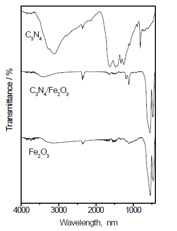 FT-IR examination: Figure 3 shows the FT-IR spectra of the g-C3N4, Fe2O3 and g-C3N4/Fe2O3. The results reveal that the formation of g-C3N4 was confirmed by the existence of a graphite-like sp2-bonding state and adsorption at 810 cm-1, which corresponds to the breathing mode of triazine. The characteristic stretching vibration of the tri-s-triazine heterocyclic rings is apparent in the range of 1200 to 1600 cm-1. The bands observed at 1317 and 1610 cm-1 are related to the C(sp2)-N and C(sp2)=N stretching modes, respectively. The broad band from 2900 to 3400 cm-1 is generally related to the stretching and deformation modes of the residual N-H groups and their intermolecular hydrogen bonding. For the g-C3N4/Fe2O3 composite, the weak peaks of g-C3N4 appeared in the spectrum of the sample with a low quantity of g-C3N4. The peaks at 1200 cm-1 and 3000 cm-1 are attributed to the C-N stretching vibration and N-H stretching mode of g-C3N4 in the g-C3N4/Fe2O3 sample.
