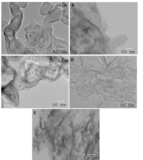 Figure 4. TEM images of g-C3N4 and Fe2O3@ g-C3N4 nanocomposites, where (A) g-C3N4; % (B) Fe2O3@ g-C3N4-1 wt%;(C) Fe2O3@ g-C3N4 -2 wt%; (D) Fe2O3@ g-C3N4 -3 wt% and (E) Fe2O3@ g-C3N4 -4 wt% samples