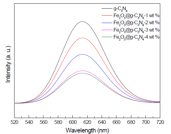 PL spectra examination: The PL spectra of g-C3N4 and Fe2O3 doped on g-C3N4 nanocomposite samples is shown in Figure 6. The results demonstrated that the Pl peak intensity of g-C3N4 decreased as the weight percent of Fe2O3 was increased from 0 to 4 wt%. Thus, the presence of Fe2O3 on the g-C3N4 surface prevents electron- hole recombination by trapping photogenerated electrons.