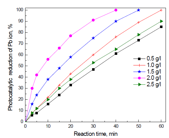 Effect of dose of Fe2O3 doped on g-C3N4 -3 wt% photocatalyst on the photocatalytic activity of g-C3N4 nanocomposites for the removal of Pb ions: The effect of the dose of Fe2O3 doped on g-C3N4 -3 wt% photocatalyst on the photocatalytic activity of g-C3N4 nanocomposites for the removal of Pb ions is shown in Figure 8. The results reveal that the photocatalytic activity of Fe2O3 doped on g-C3N4 -3 wt% photocatalyst increased from 85 to 100% by increasing the dose of Fe2O3 doped on g-C3N4 -3 wt% photocatalyst from 0.5 to 1.0 g/L, respectively. Increasing the dose of Fe2O3 doped on g-C3N4 -3 wt% photocatalyst from 1.0 to 1.5 to 2.0 g/L decreases the reaction time required for the complete reduction of Pb ions from 60 to 50 to 40 min, respectively. This can be attributed to the fact that an increased dose of Fe2O3 doped on g-C3N4 -3 wt% photocatalyst will increase the number of active sites available for photocatalytic reduction. However, increasing the dose of Fe2O3 doped on g-C3N4 -3 wt% photocatalyst above 2.0 g/L increases the reaction time again from 40 to 60 min. Increasing the dose above a certain amount hinders the penetration of light to the surface