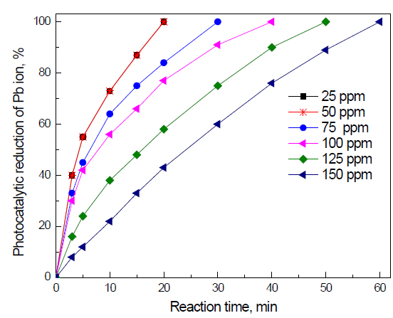 Effect of initial concentration of Pb ions on the photocatalyst photocatalytic activity of g-C3N4 nanocomposites for the removal of Pb ions: The effect of initial concentration of Pb ions on the photocatalyst photocatalytic activity of g-C3N4 nanocomposites for the removal of Pb ions is shown in Figure 9. The results reveal that increasing the concentration of Pb ions from 25 to 100 ppm has no significant effect on the reaction time required to complete the reduction of Pb ions (20 min). Increasing the initial concentration from 50 to 75 to 100 to 125 to 150 increases the reaction time from 20 to 30 to 40 to 50 to 60 min, respectively.