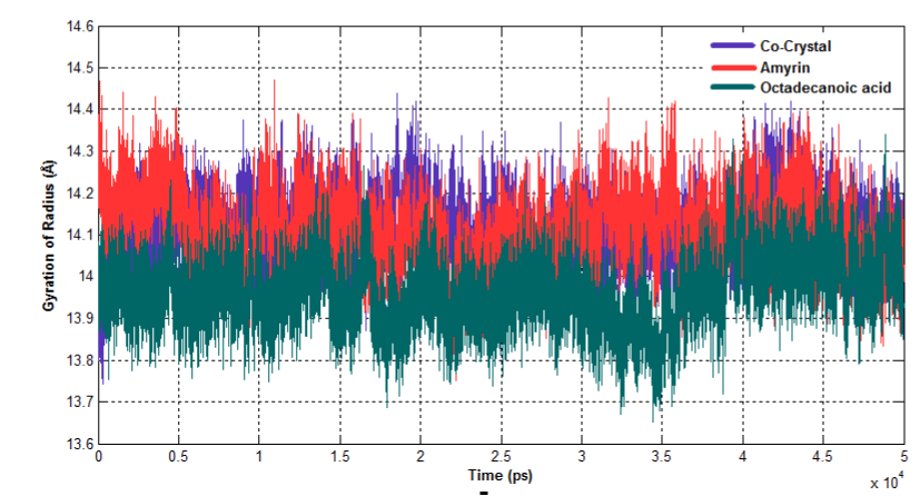 The dynamic behavior of both complexes were calculated using RMSD, RMSF and Rg. RMSD for all the Cα atoms were calculated from the initial structure to study the convergence of the protein system (Figure 14a). In a case of Venom PLA2, cocrystal complex and amyrin bound complex showed similar trend of deviation till the end of simulation. At 15ns, the cocrystal complex remains much deviated than amyrin bound complex, resulting in final backbone RMSD of 2.0 to 2.3Ǻ during the simulation. Amyrin bound complex retained less deviation till the end of simulation. Octadecanoic acid bound complex exhibited higher fluctuation from 20ns to the end of simulation resulting in a backbone RMSD of 2.5 to 2.9 Ǻ. RMSD of human PLA2 is shown in (Figure 14b). Cocrystal complex and octadecanoic acid bound complex deviate much at 42ns and 35ns, respectively, resulting in backbone RMSD of 2.2Ǻ. Amyrin bound complex retained less deviation till the end of simulation and it maintains the stability.