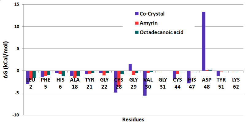 The residue wise decomposition energy was calculated using the residues involved in hydrogen bond and hydrophobic interactions that can contribute to the delta free energy. In venom PLA2 complex, Leu2, Cys29, Cys45 and His48 residues contribute the minimum range of delta free energy (Figure 17a). The major contribution of free energy comes from Leu2, Phe5, Ala18, Tyr21, and Gly22 for all human PLA2 complexes shown in (Figure 17b). In cocrystal complex, Asp48 showed maximum energy of about 13 kcal/mol which is not favorable. In amyrin and octadecanoic acid bound complex, Cys44 and His47 maintain the least energy than the cocrystal complex.