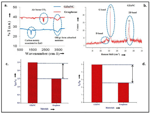 Figure 2. a) FT-IR spectrum of GZnNC (b) Raman traces of GZnNC sample (c) and (d) represent comparative bar diagram of I2D /I G and IG /ID with GZnNC and graphene, respectively.