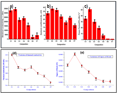 Figure 5. Comparative bar diagram of (a) Electrical conductivity, (b) Seebeck coefficient, (c) Power Factor (PF), (d) thermal conductivity and (e) Figure of merit of different composition based on PEDOT:PSS and GZnNC. [see also S3 in electronic supporting information(ESI)].