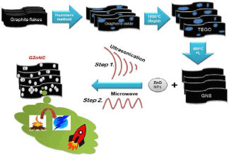 GZnNC was obtained by scattering 50 mg graphene through ultrasonication in ethanol after addition of pre-dispersed ZnO nanoparticles to the dispersion of graphene. The resultant dispersed combination was subjected to ultrasonication for two hours tailed by drying at room temperature to remove the solvent. GZnNC was placed over a petri dish and exposed to microwave irradiation for two minutes to have better exfoliation after drying (Scheme 1).