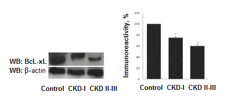 We have detected a decrease of anti-apoptotic factor BcL-xL levels. Detailed analysis shows that levels of BcL-xL decrease gradually depending on kidney function impairment. In nephrotic children with preserved kidney function BcL-xL levels were decreased to 75,1±2,2% in comparison to control values (р<0,01). In patients with CKD II-III decrease in BcL-xL documented as 60,1±1,8% of control value (та р<0,001) (Figure 1).