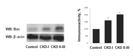 In contrast, increased levels of pro-apoptotic factor Bax evaluated in all nephrotic children. Levels of Bax are dependent of kidney function. In patienst with CKD I Bax expression increased by 60,3±7,5% as compared to control (р<0,01) and by 90,1±9,8% (р<0,001) in children with CKD II-III (Figure 2).