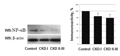 We performed measurement of NF-κB (р65 subunit) that is responsible for protection against apoptosis. A pronounced decrease of its activity detected in all nephrotic children. In nephrotic patients with CKD I the level of NF-κB decreased by 15,2±5,9% as compared to control (Р<0,01) and by 20,6±6,4% in nephrotic patients with CKD II-III (Р<0,001). Comparison between CKD I group and CKD II-III group doesn’t show any statistical difference (Figure 3).