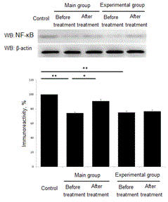 After the course of treatment all patients were analyzed for NF-κB levels. In patients of main group the level NF-κB before treatment was down regulated to 74,2±1,06% in comparison to control group (р<0,001). Control group value we set as 100%. After the course of treatment the level of NF-κB increased up to 90,8±2,51% (р<0,01). In children from experimental group level of NF-κB was down regulated to 75,1±1,98% (р<0,001) as compared to control group. After the treatment we found a slight increase in NF-κB up to 76,7±2,17% (р>0,05). (Figure 5).