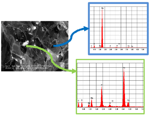 The EDS analyses (Figure 3) put in evidence the magnesium and β-TCP presence as fillers in collagen matrix. The distribution of the magnesium particles is relatively uniform although some particles agglomerated during the process.
