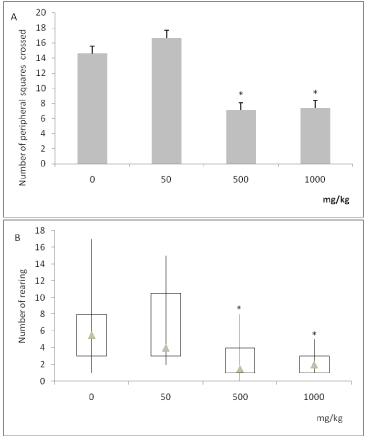Figure 4. Effects of chronic ascorbate treatment on rats exposed to the open-field test. Number of entries into peripheral squares (Panel A, ANOVA followed by Tukey). Number of rearings (Panel B, Kruskal-Wallis followed by Dunn). *Values significantly different from control group (0 mg/kg), p<0.05