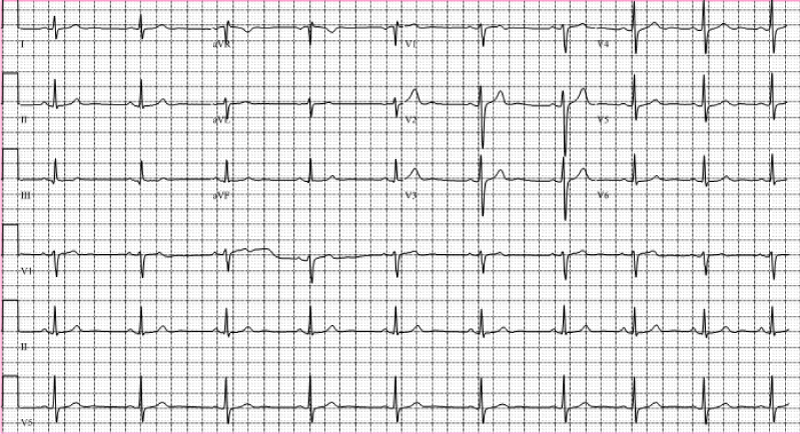 37-year-old male with stage IV mixed germ cell tumor of right testicle, with retroperitoneal lymphadenopathy and lung masses presented for cycle 2/4 of etoposide based chemotherapy and was found to be severely bradycardic with chest pain. Patient was not complaining of lightheadedness or dizziness. Vital signs were remarkable for blood pressure of 120/70 mm Hg, pulse of 28 beats per minute, respiratory rate of 20 breaths per minute, saturating 100% on room air. Physical exam did not reveal any murmurs or gallops, but patient did have bradycardia. Comprehensive metabolic profile was within normal limits, and complete blood count was remarkable for chronic thrombocytopenia of 97 10*3/uL. TSH level was 3.0 mIU/L and free T4 was 1 ng/dL. Electrocardiogram showed sinus bradycardia with a rate of 28 beats per minute, without ischemic changes (Figure 1). Electrocardiogram prior to initiation of chemotherapy showed a sinus rhythm with a normal heart rate (Figure 2). Cardiac injury panel was not suggestive of ischemia. Chest x-ray and CT angiography of the thorax were also normal. The patient was treated with atropine on presentation and heart rate normalized transiently, but eventually became bradycardic again. Of note, the patient had episodic bradycardia following his first cycle of chemotherapy as well, and the electrocardiogram before the first cycle of chemotherapy showed heart rate was within normal range. Nuclear stress test was also done and it did not suggest ischemic changes. Patient was discharged and advised to avoid beta-blockers. On outpatient follow up, he was noted to have returned to normal sinus rhythm. Chemotherapy was resumed with cardiac monitoring.