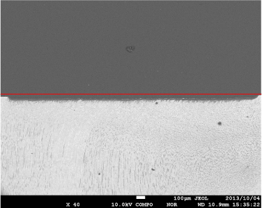 Figure 1. COMPO image (×40) of cross-section of whole eroded window. Half of the window (right side) was sonically brushed using bristles with tapered tips and slurry containing 0.5% CMC, and applying a pressure of 4 g per mm2. The lower magnification image was used to adjust the tilt of the slab surface to a horizontal plane, indicated as a red line