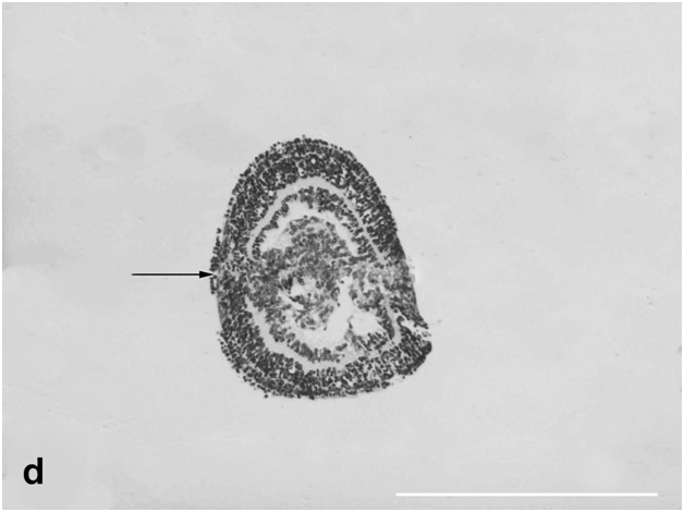 Figure 3d:Cell behavior in newt retina under conditions of long term organotypic roller culturing - general view of newt retina cultured for 4 weeks in vitro, arrow shows spheroid primary closure, scale bar represents 500 μm.