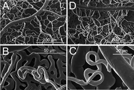 Figure 1 A-D. Scanning electron micrographs of retinal vessels in dystrophic RCS rats.
