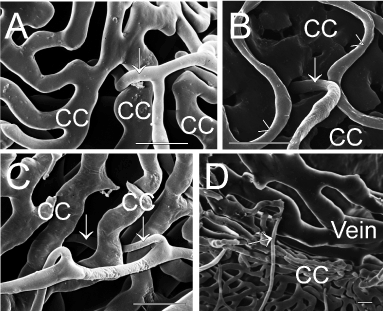 Figure 2A-D. Scanning electron micrographs of penetrating retinal vessels (marked by arrows) through the choriocapillary layer (cc) in 6 months old dystrophic RCS rats. Scale bar=20 µm.