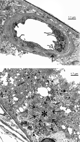 Figure 4 A, B. Transmission electron micrographs of a 6 months old dystrophic RCS rat showing newly formed vessels within the RPE layer.) single vessels show a non-fenestrated endothelium with microvilli-like processes and long spacin collagen (arrow). b) ‘ghost vessels’ within the RPE show a continuous basal membrane (arrows), filled with collagen (asterisks), but no endothelium and no lumen.