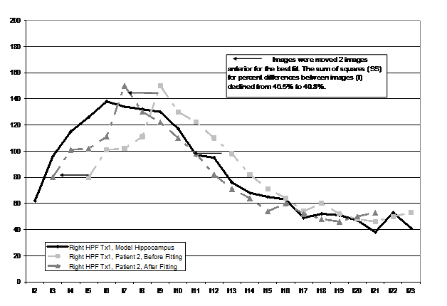 From this point, the right HPF of each patient was aligned with the MHPF by moving all images anterior or posterior up to six images. The move (or lack thereof) that resulted in the lowest least squares difference between the right participant’s HPF and the right MHPF was used as the final placement (e.g., plus 2, would be the conversion of an image that was originally image 3 to image 1; minus 2 would be conversion from image 3 to image 5). The LSRM procedure corrected for differences in placement within the scanner between time one and time two and across participants (i.e., rotation, yaw, and pitch). Conversions were completed manually and viewed visually in a manner identical to that seen in Figure 1). Once this was accomplished, the left HPF of the participant was aligned to the right HPF of the participant. Images from time two (re-measurement of the HPF one-two years after treatment) were first aligned (right time one to right time two) and then the left HPF was aligned to the right HPF (both time two). By implementing this LSRM procedure, we were able to control for participant’s placement within the scanner as it changed from time one to time two and to reduce the inter-subject variability in HP volume measurements. A check of the manipulation using paired t-tests revealed a significant improvement in all re-alignment procedures as measured by a significant reduction in sums of squares between images (Table 1).