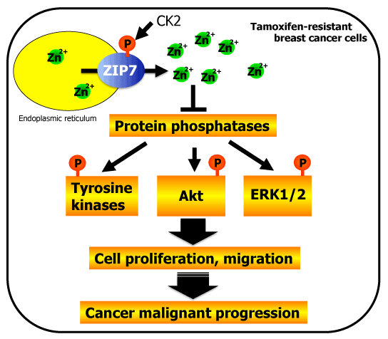 Upon stimulation, normal cells exhibit "early" and "late" events [22]. Early zinc signaling originates from the endoplasmic reticulum (ER) and is observed several minutes after stimulation. Then the released zinc can modulates the activities of intracellular signaling molecules. ZIP7, which is located in the ER membrane, mediates this early zinc influx. Phosphorylation by casein kinase II (CK2), an enzyme that promotes cell division, is required for ZIP7 activation and results in the release of zinc ions from the ER into the cytoplasm. The released zinc ions inhibit protein phosphatases and enhance the activity of tyrosine kinases as well as the Akt survival and ERK1/2 growth signaling pathways, which together increase cancer progression (Figure 2) [26]. ZIP7 is abundantly expressed in tamoxifen-resistant MCF-7 breast cancer cells, where it is located in the ER [28]. Since ZIP7 activation by CK2 enhances the proliferation and migration of breast cancer cells, it may be a promising and novel molecular target for breast cancer chemotherapy [25,26]. However, several questions remain to be answered: are the above-described observations limited to tamoxifen-resistant breast cancer cells? Are these results mimicked in vivo? Are other zinc transporters besides ZIP7 involved? Is the release of zinc ion from the ER dependent on ZIP7 activity? One challenge in answering these questions is that free zinc levels in the ER and elsewhere in the cell vary greatly depending on the detection assay used (zinc small-molecule sensors, genetically encoded fluorescence resonance energy transfer [FRET] sensors), although consistent results have generally been reported for cytosolic levels [36].